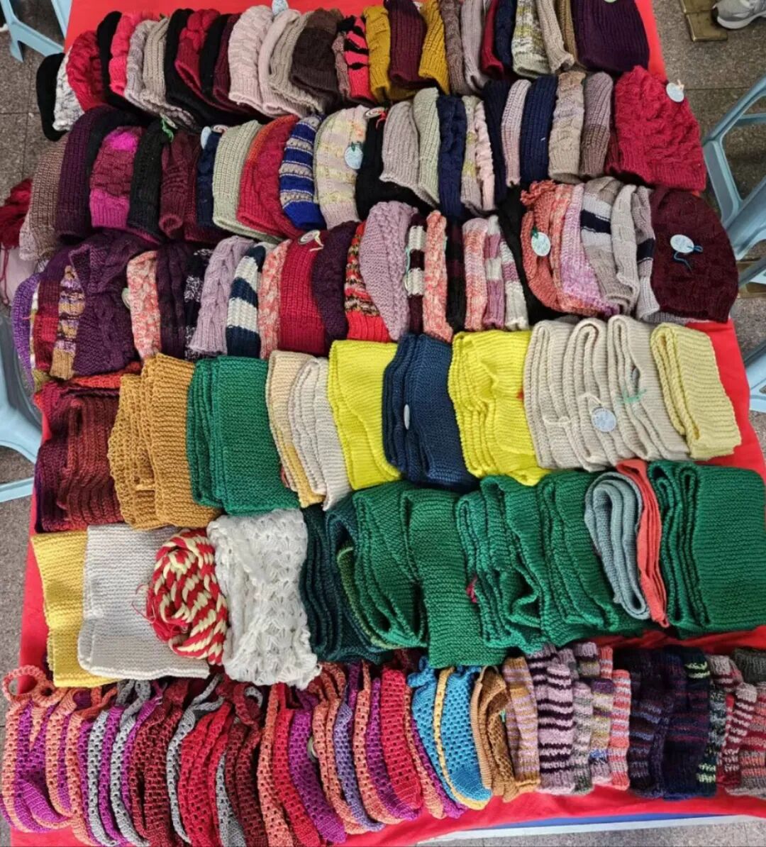 志愿者们早早来到4S办公室,久别重逢像是有说不完的话。一边热情地问候着,一边从大包小包里拿出自己精心编织的帽子围巾等物品。不一会儿毛线织品就堆成了一座小山。这一件件色彩丰富,针脚细致的作品,倾注了志愿者满满的爱心和奉献之情!