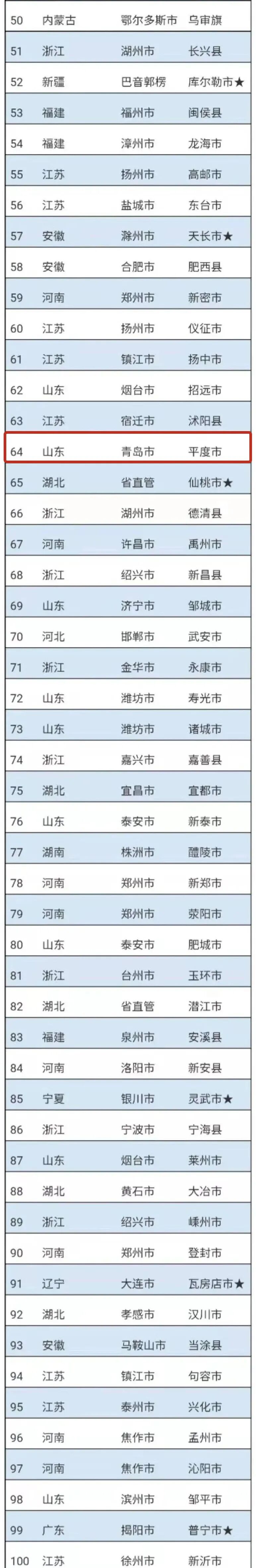 龙口市第12位、胶州市第17位、荣成市第30位、广饶县第35位、滕州市第46位、招远市第62位、平度市第64位、邹城市第69位、寿光市第72位、诸城市第73位、新泰市第76位、肥城市第80位、莱州市第87位、邹平市第98位。
