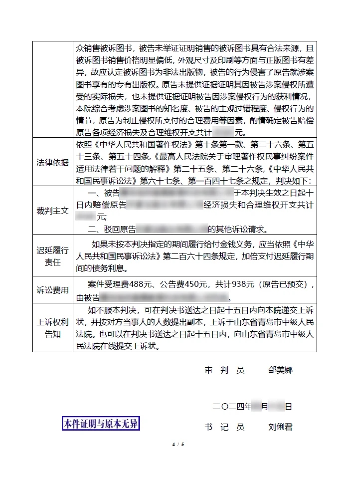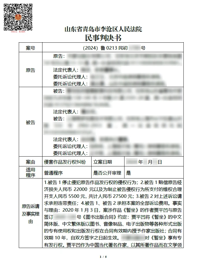 青岛日报社/观海新闻5月15日讯 记者15日从李沧法院获悉,该院首次在一起侵犯作品发行权的知识产权案件中,创新使用"表格式"判决书,对推进知产审判简案快审、提速增效进行新探索。