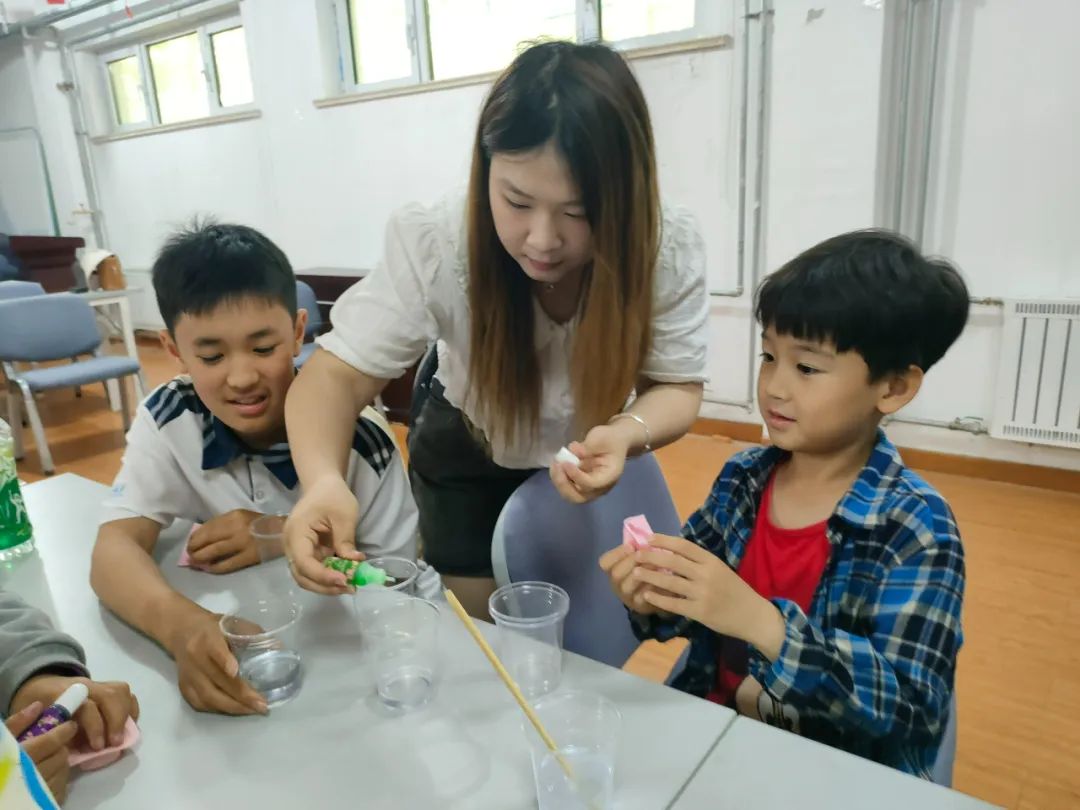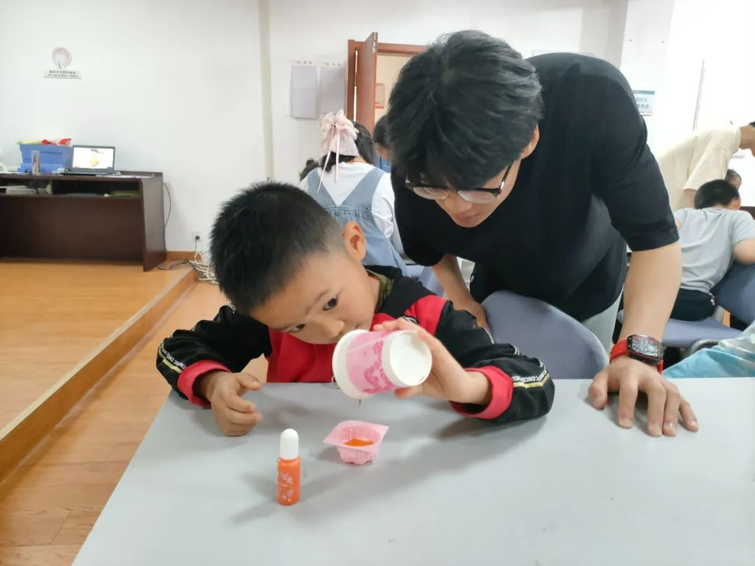 知识储备充足后,孩子们迫不及待大展拳脚,在社工与志愿者的帮助下,孩子们以组为单位,共同合作,轮流搅拌融化树脂,随后倒入模具,并放入装饰品稍加点缀,看着自己亲手制作的“艺术品”,孩子们迫不及待与身边同伴以及家长分享。“我们前段时间在课本上学习过天然琥珀,今天竟然自己动手制作了人工琥珀,我现在对它的成品非常期待。”一位小朋友举着自己制作的琥珀向社工分享到。