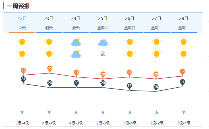 22日下午到23日白天晴间多云,南风3~4级阵风6级,23日晨最低气温济阳区、莱芜区、钢城区、商河县、南山区、起步区19℃左右,市区及其它区县24℃左右,23日最高气温35℃左右。
