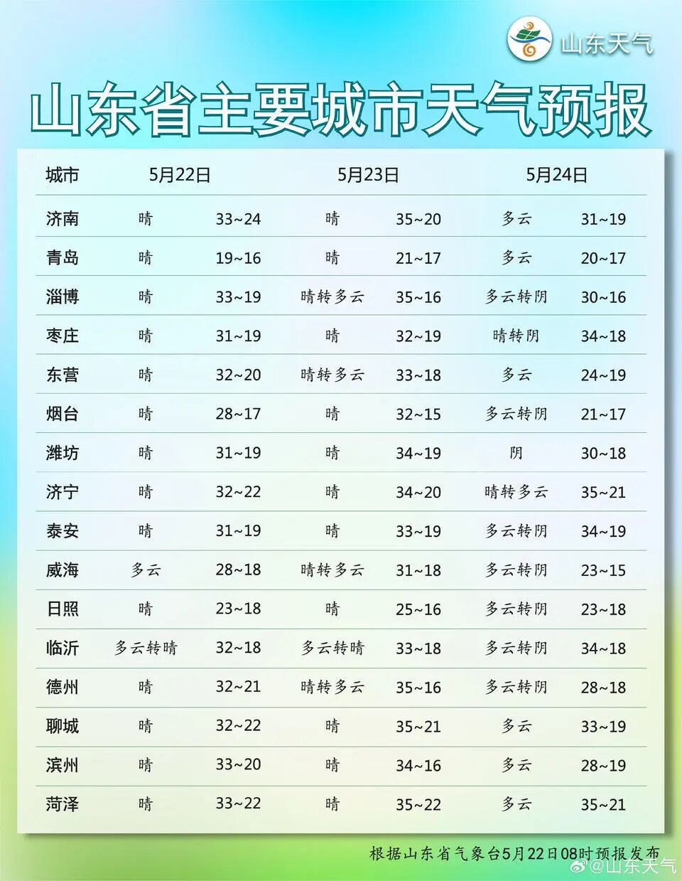5月22日至24日,山东晴热升级,菏泽、济南、潍坊等地最高气温可达35℃左右,或有高温出没,公众请注意做好防暑降温工作。