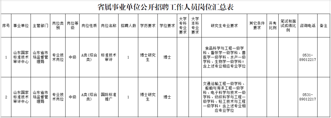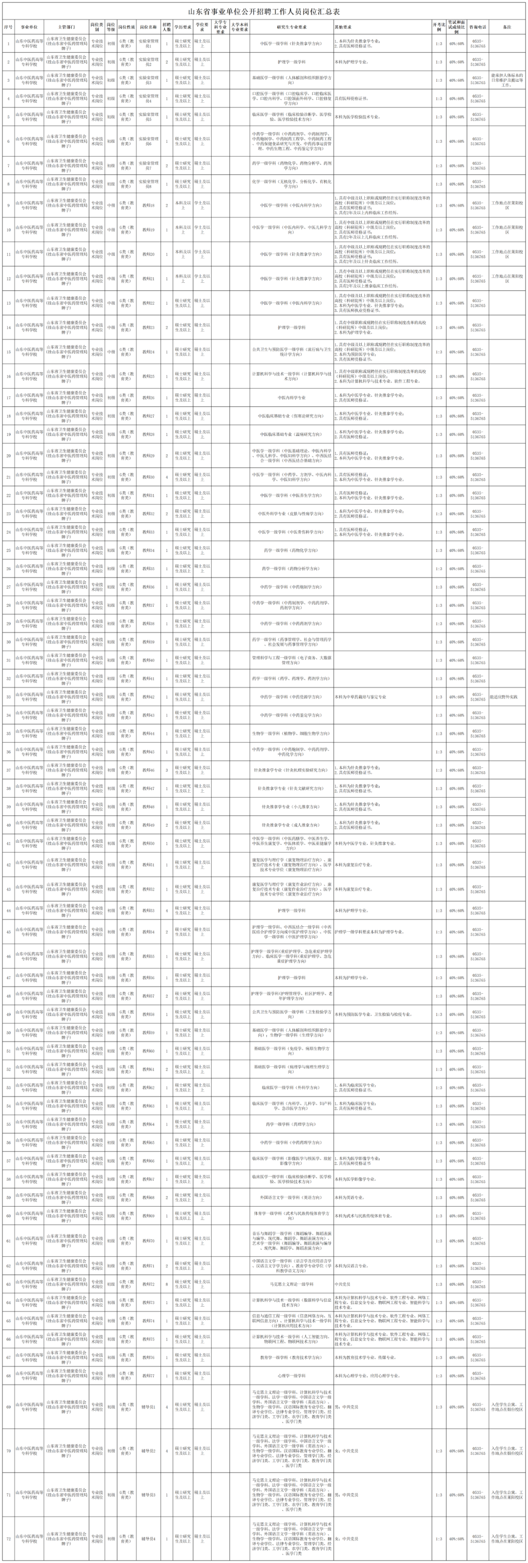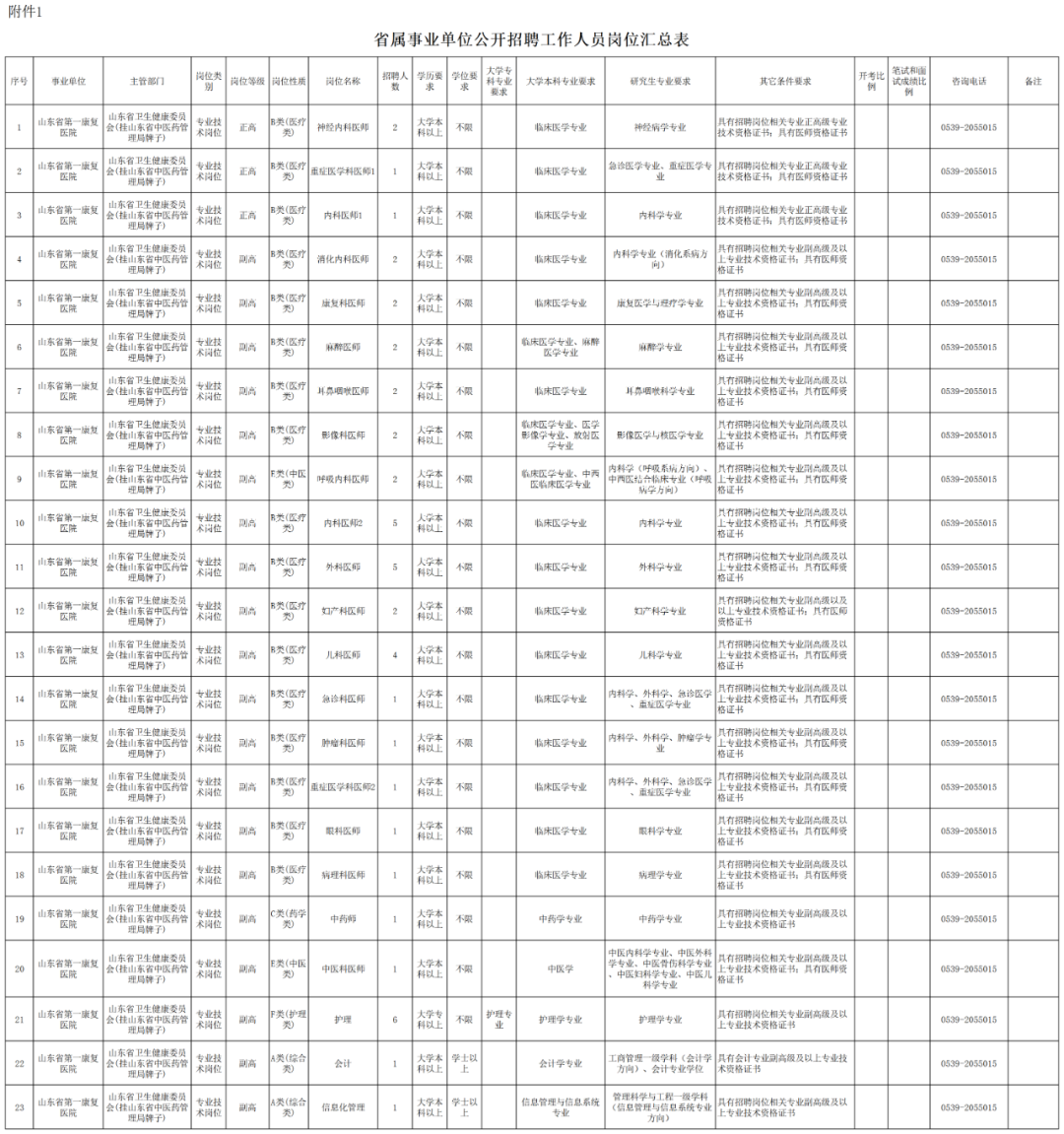 详见《山东省事业单位公开招聘工作人员岗位汇总表》(附件1)。