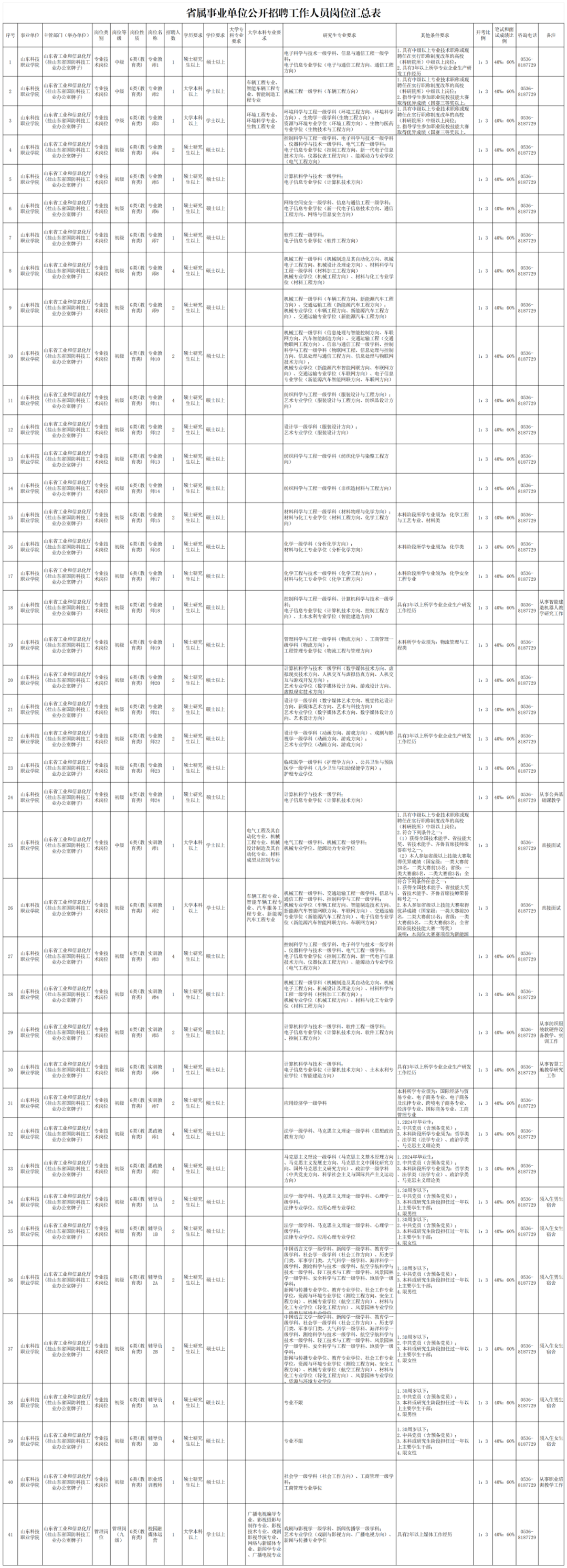 根据事业单位公开招聘有关规定,结合工作需要,山东科技职业学院拟面向社会公开招聘工作人员76名,其中:中级专业技术岗位4人,初级专业技术岗位71,管理岗位1人。具体岗位及条件详见《省属事业单位公开招聘工作人员岗位汇总表》