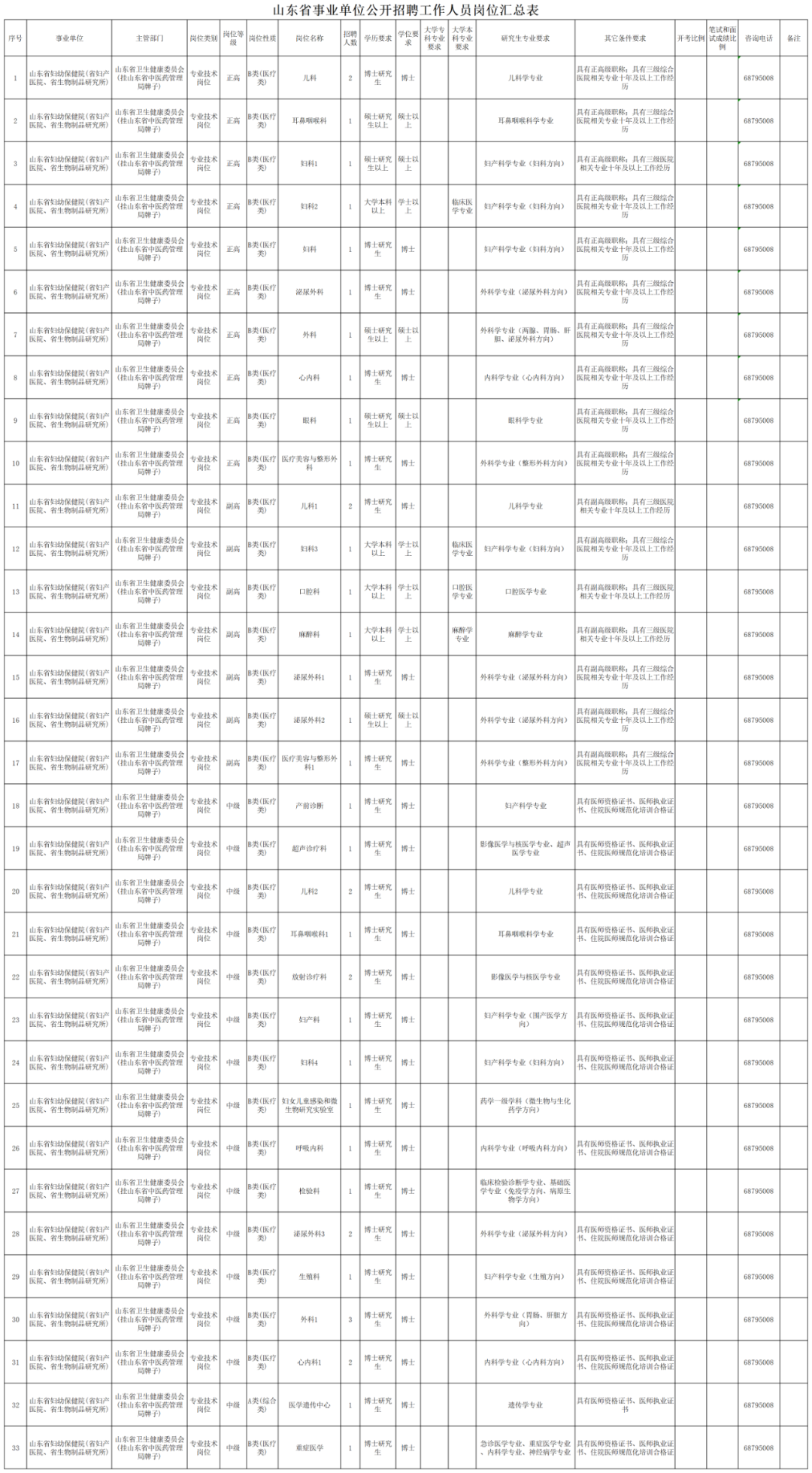 根据事业单位公开招聘有关规定,结合工作需要,山东省妇幼保健院拟面向社会公开招聘工作人员41名,其中中级专业技术人员22名;高级专业技术人员19名。具体岗位及条件详见《省属事业单位公开招聘工作人员岗位汇总表》。