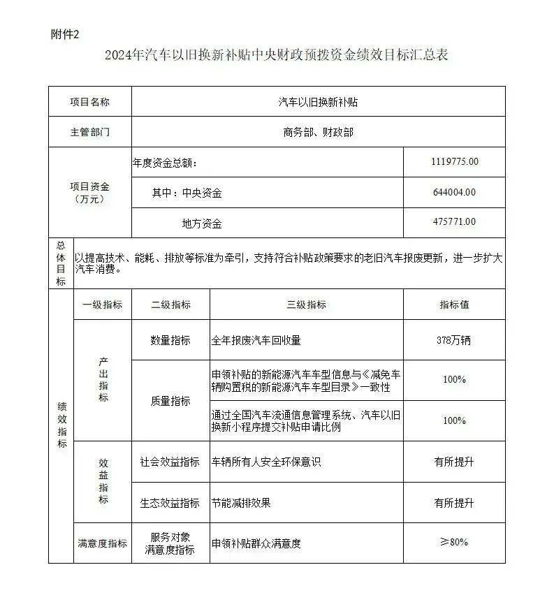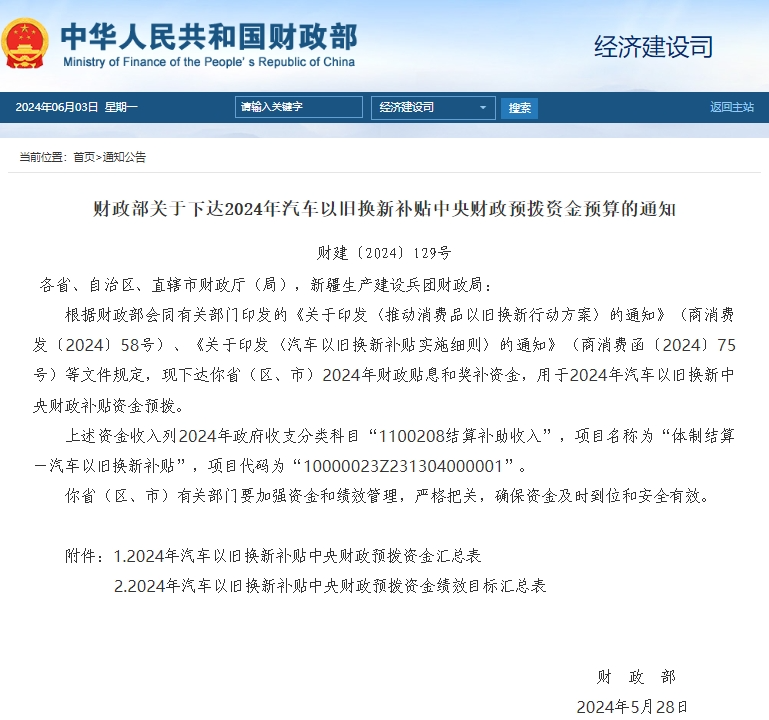 早前报道:64.4亿元!财政部下达2024年汽车以旧换新补贴