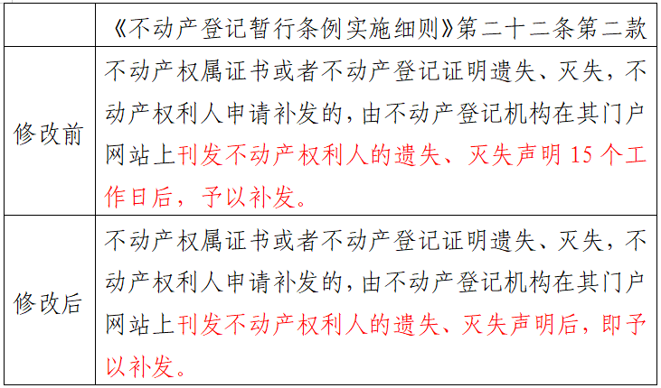 青岛日报社/观海新闻6月6日讯 为贯彻落实党中央、国务院关于优化营商环境有关决策部署,提升不动产登记服务效能,日前,自然资源部公布了《关于第六批修改的部门规章的决定》,决定修改《不动产登记暂行条例实施细则》,将第二十二条第二款修改为“不动产权属证书或者不动产登记证明遗失、灭失,不动产权利人申请补发的,由不动产登记机构在其门户网站上刊发不动产权利人的遗失、灭失声明后,即予以补发。”不再要求发布声明满15个工作日,再予以补发。