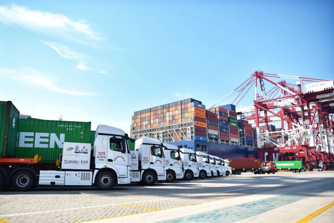 在山东港口青岛港,港口专用氢能集装箱卡车正在码头上作业