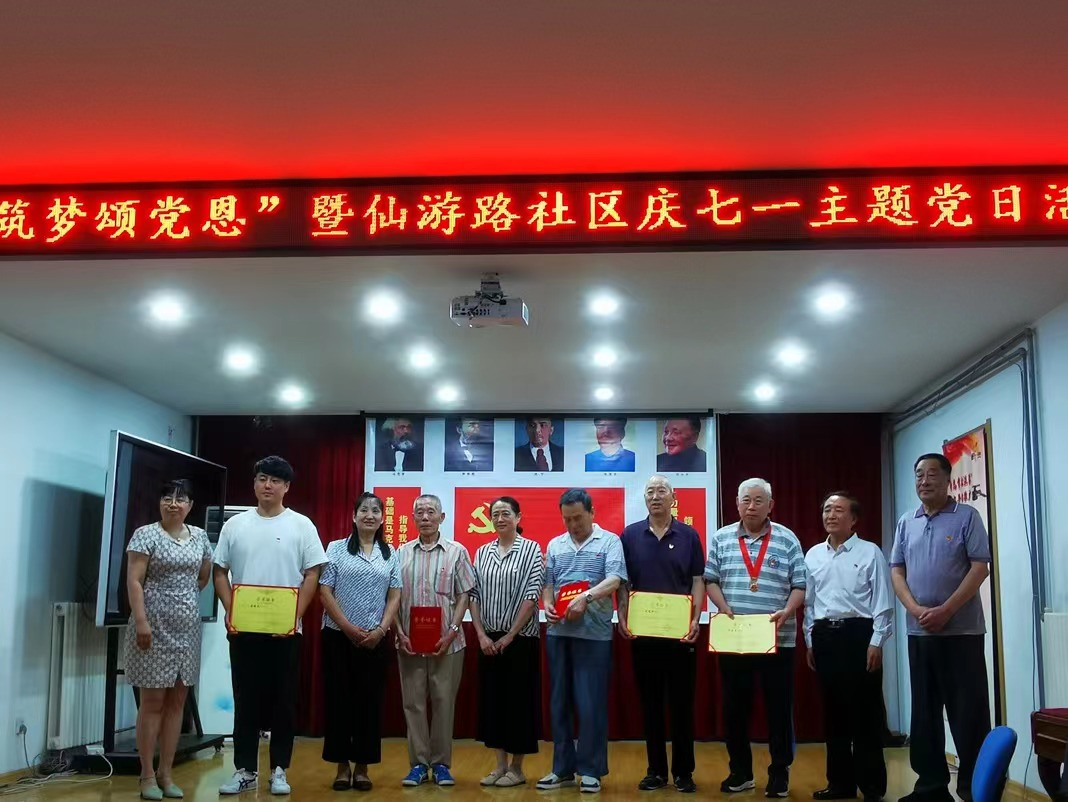 首先,仙游路社区党委成员为光荣在党50年的老党员代表孙海、王续魁、周京来分别颁发纪念章。同时表彰了优秀片区支部书记和优秀共产党员.并为他们颁发了证书,优秀代表上场发表获奖感言,抒发了他们对党的感情和热爱。