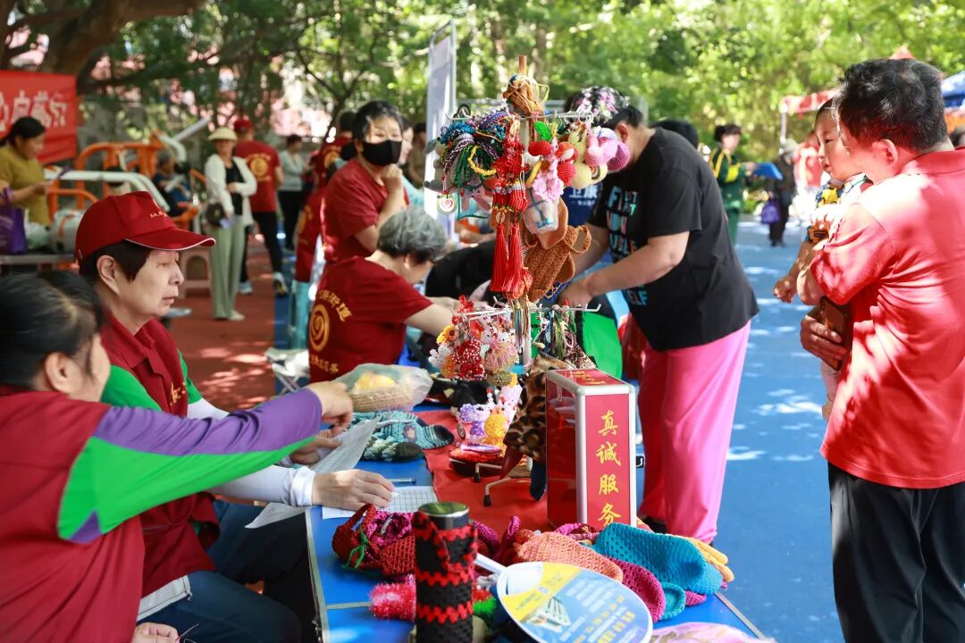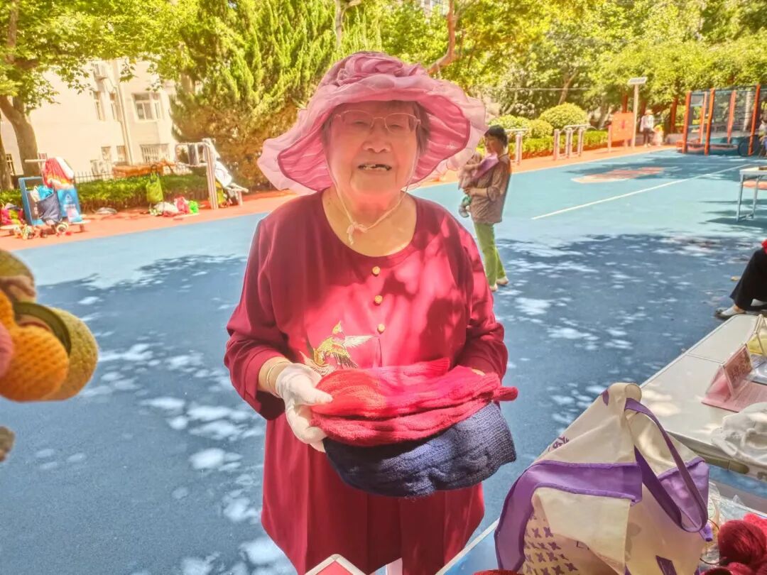 社区居民韩秀芳今年已经82岁了,她顶着烈日骄阳也来到活动现场,开心地把她亲手编织的帽子交到毛线组,现场的志愿者和居民被她的奉献精神深深地感动了。