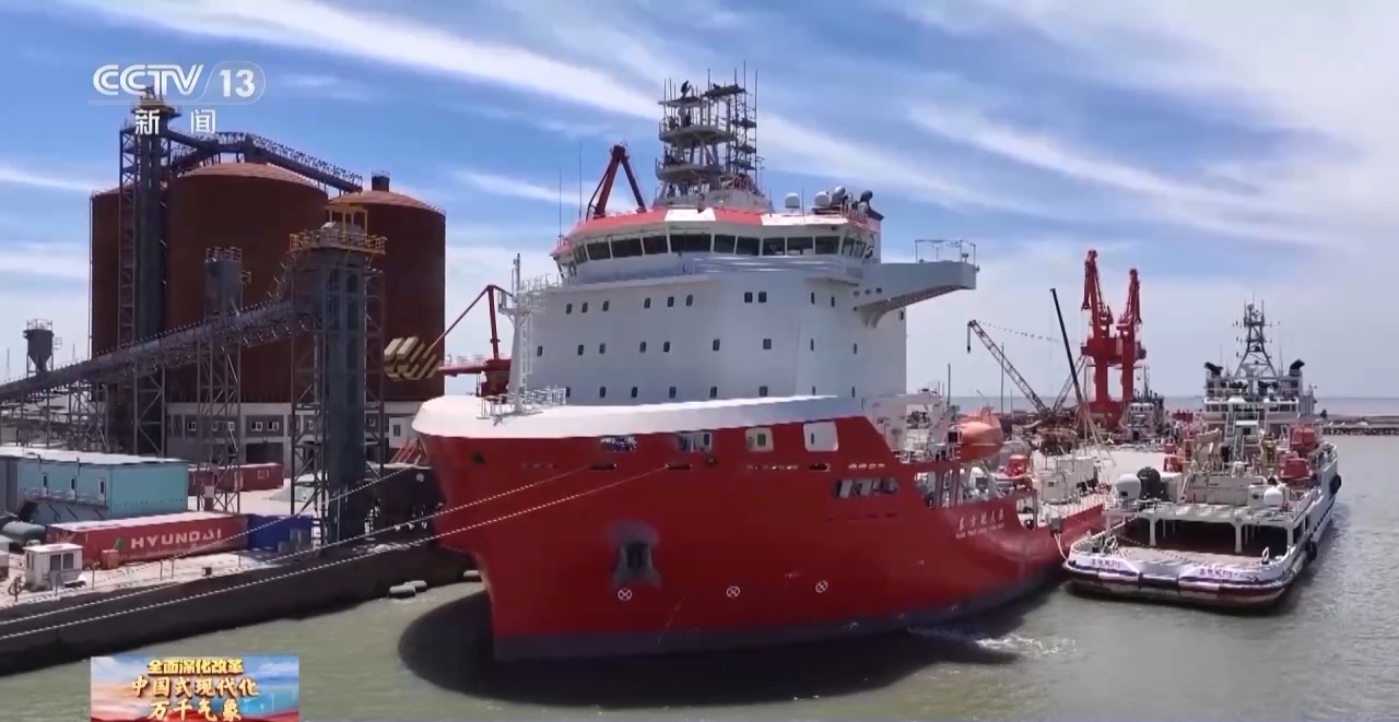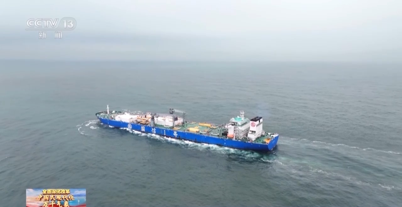 总台记者 李秉禅:我现在所在的这艘船,正航行在东海北部的浙江舟山海域,距离海岸大概50海里,我们从浙江的岱山码头乘船出发,用了6个小时才到达这里。这艘船长249.9米,宽45米,光甲板面积就相当于26个篮球场的大小。从2022年开航以来,已经累计航行了12000多海里。
