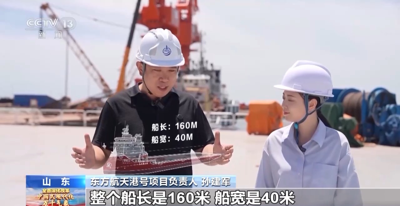 东方航天港号项目负责人 孙建军:它经过特殊设计,整个船长160米,船宽40米,甲板的面积4000多平方米,相当于40个标准篮球场的大小;主甲板经过加强,承载力是20吨每平方米,可以承受十几辆家庭轿车的重量。从能力上来讲,我们可以一次携带多发火箭。
