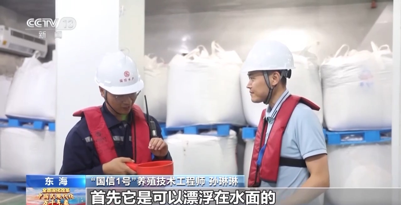 “国信1号”养殖技术工程师 孙琳琳:鱼饲料也有很多特点,它是可以漂浮在水面的。因为根据大黄鱼的习性,如果饲料沉到水底,大黄鱼基本就不会摄食了,会造成饵料的浪费,另外还会污染水体。我们这种高品质的配合饲料,品质会更加稳定,每天投几顿、每顿投多少,我们都可以实现精准化控制,从而实现精细化、科学化的养殖。