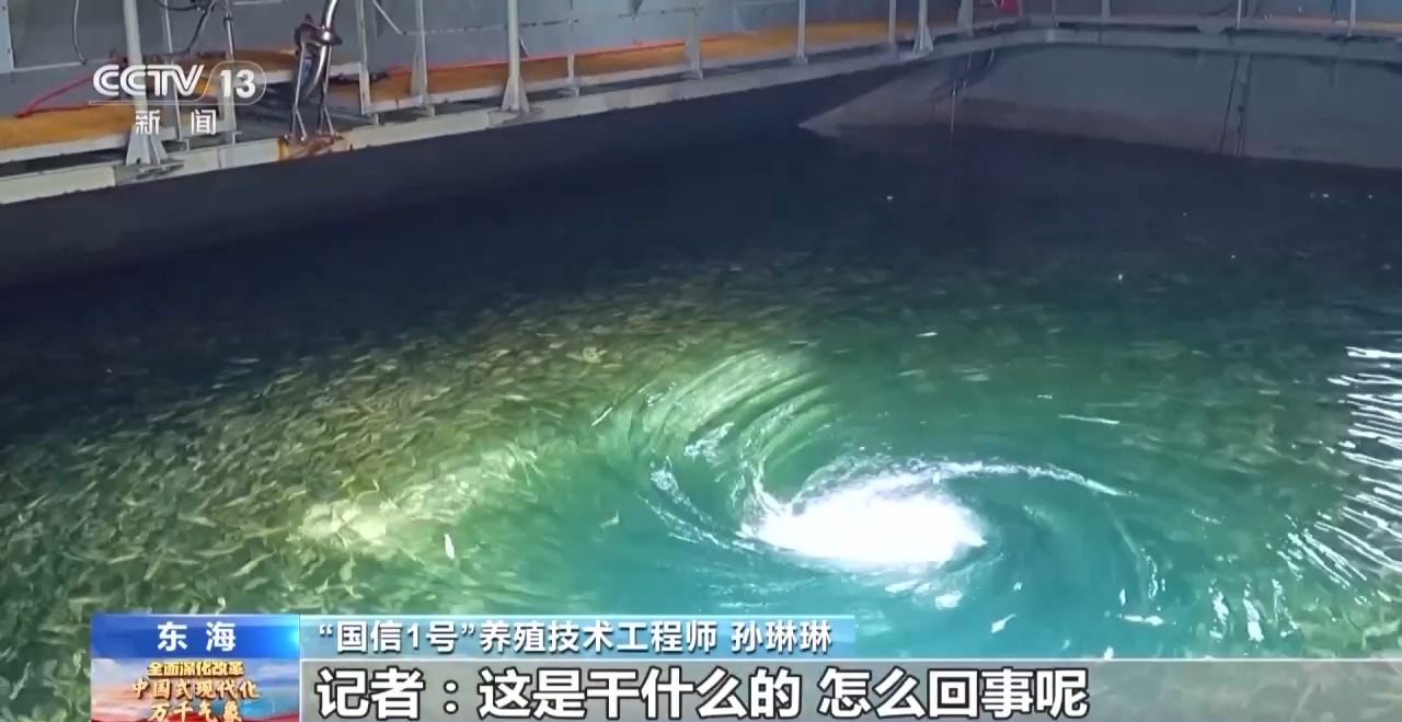 “国信1号”养殖技术工程师 孙琳琳:这也是我们养鱼的一个法宝,通过进水以及排水设计,从而形成中央这种立体式的漩涡。大黄鱼的习性就是喜欢逆流游动,我们让大黄鱼一直顶流游动,生产出的大黄鱼肉质更加紧实、鲜美。