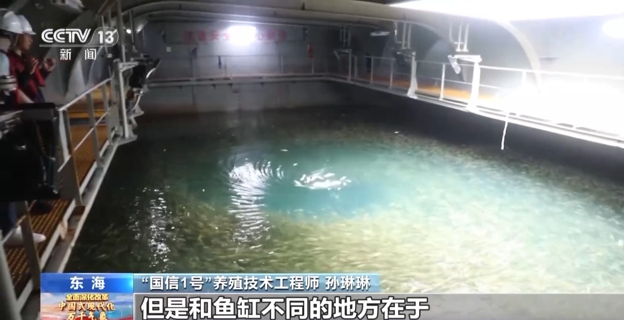 “国信1号”养殖技术工程师 孙琳琳:养殖舱整体类似于一个大型的鱼缸,但是和鱼缸不同的地方在于,我们养殖舱内的水体是活水,是通过海水泵24小时源源不断抽取船外水面以下15米干净新鲜的海水加到养殖舱中,顺便推动我们原来的旧水排到养殖舱外。