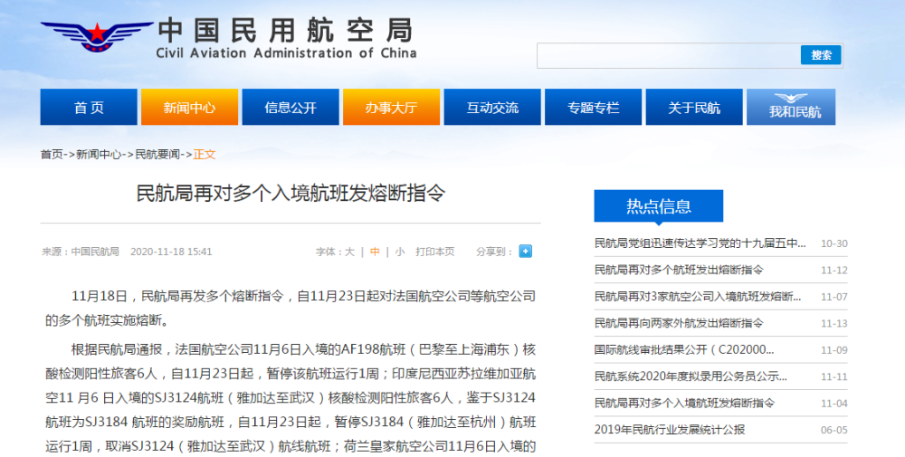 11月18日,民航局再发多个熔断指令,自11月23日起对法国航空公司等航空公司的多个航班实施熔断。