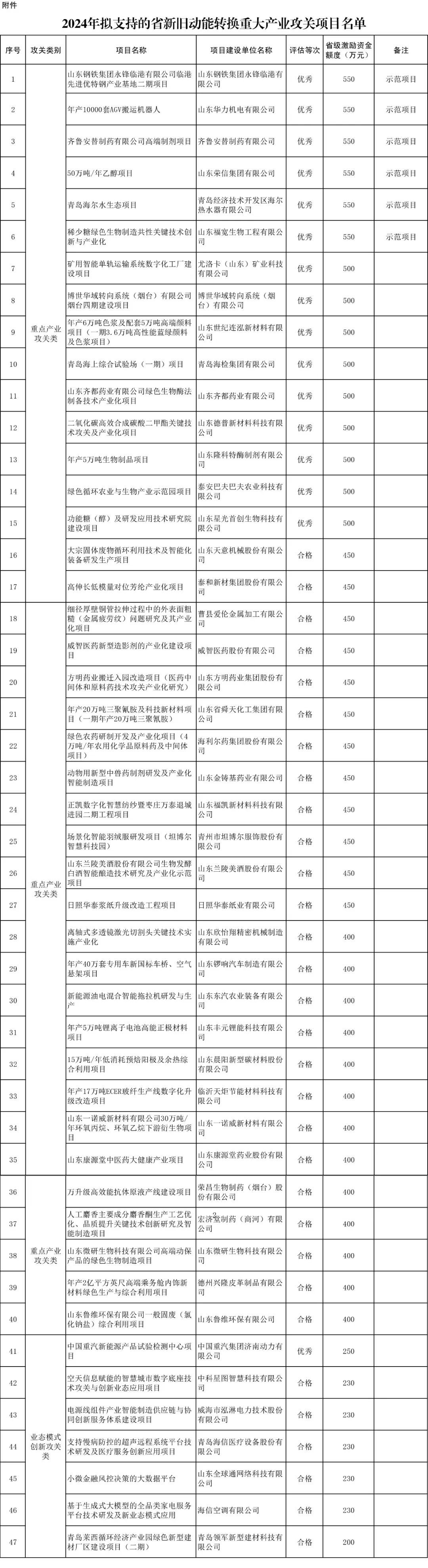 近日,山东省发展和改革委员会公示了2024年拟支持的省新旧动能转换重大产业攻关项目名单,重点产业攻关、业态模式创新攻关两大类共47个拟支持项目上榜公示如下: