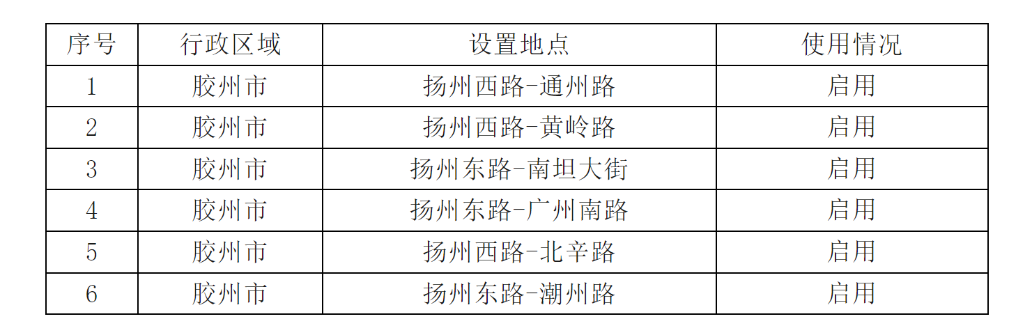 青岛日报社/观海新闻7月1日讯 为进一步加强道路交通管理,保持道路安全、畅通、有序,最大限度地预防和减少道路交通事故的发生,保障人民群众生命财产安全,同时保证交通执法工作的公开公正,日前,胶州市公安局交通警察大队决定启用胶州市境内扬州西路-通州路等路段设置的6套固定式交通技术监控设备,对交通违法行为依法抓拍取证,望广大交通参与者自觉遵守交通法规,共同维护道路交通秩序。(青岛日报/观海新闻记者 曹森)