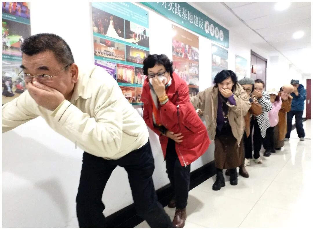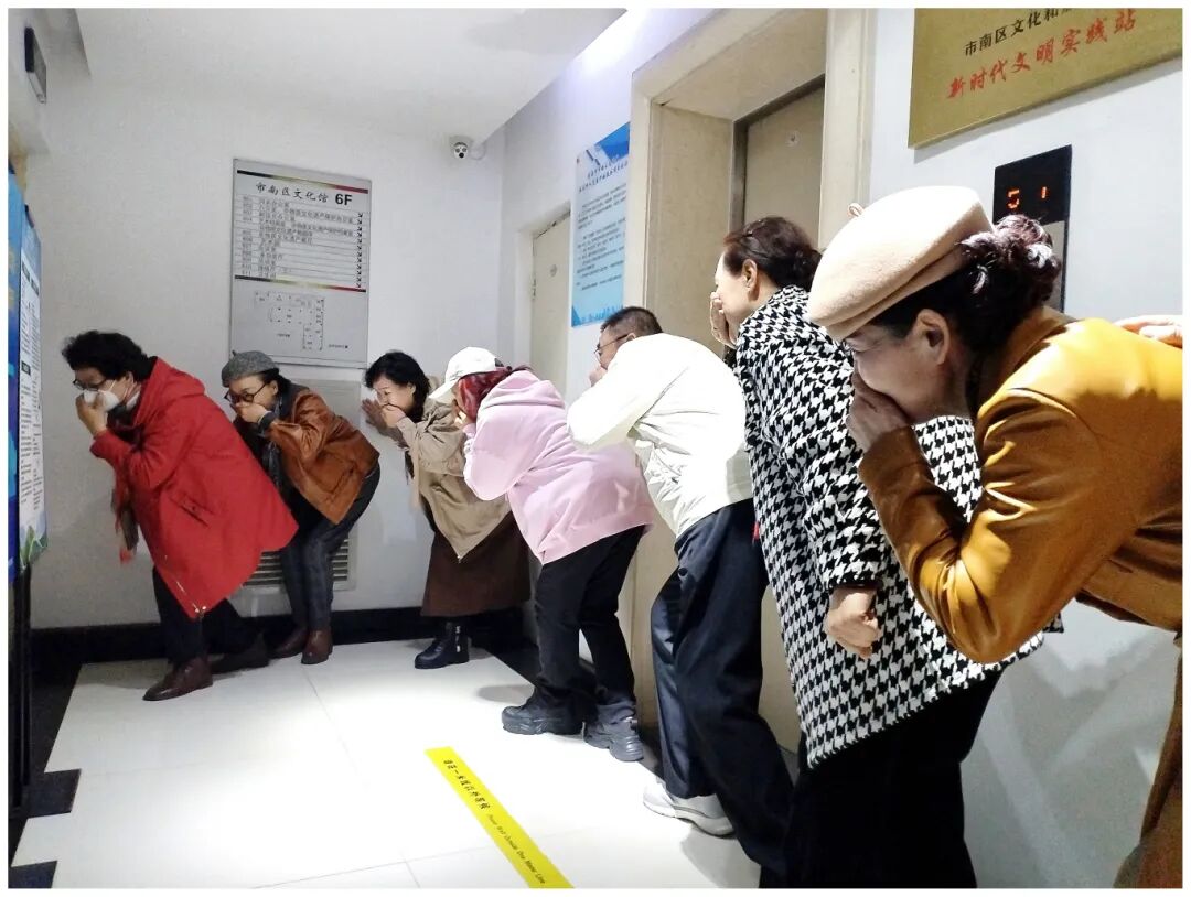 培训会议结束后,按照市南区文化馆《火灾逃生应急疏散预案》,文化馆全体人员、物业工作人员及各培训班学员,“牢记树立第一时间现场处置的理念”按照各自分工,参与文化馆春季公益培训班火灾逃生应急演练。