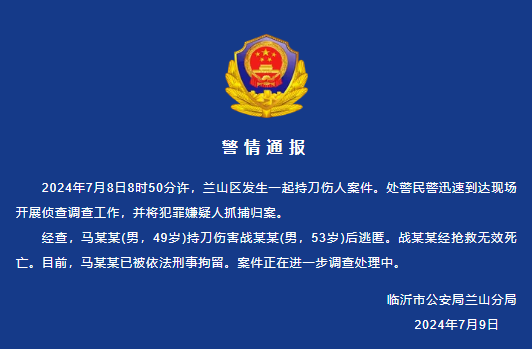 2024年7月8日8时50分许,兰山区发生一起持刀伤人案件。处警民警迅速到达现场开展侦查调查工作,并将犯罪嫌疑人抓捕归案。