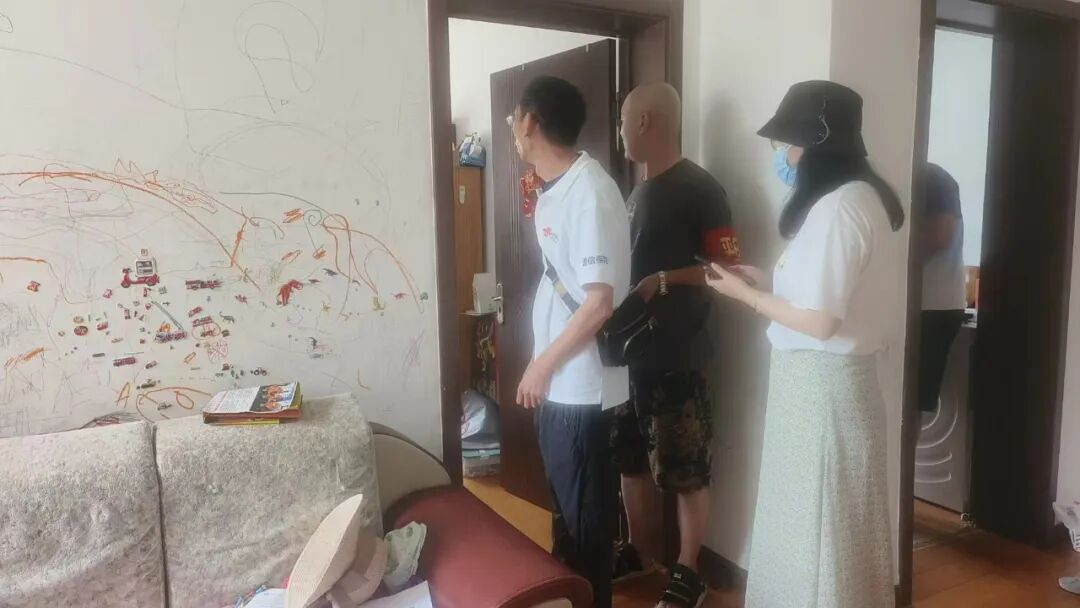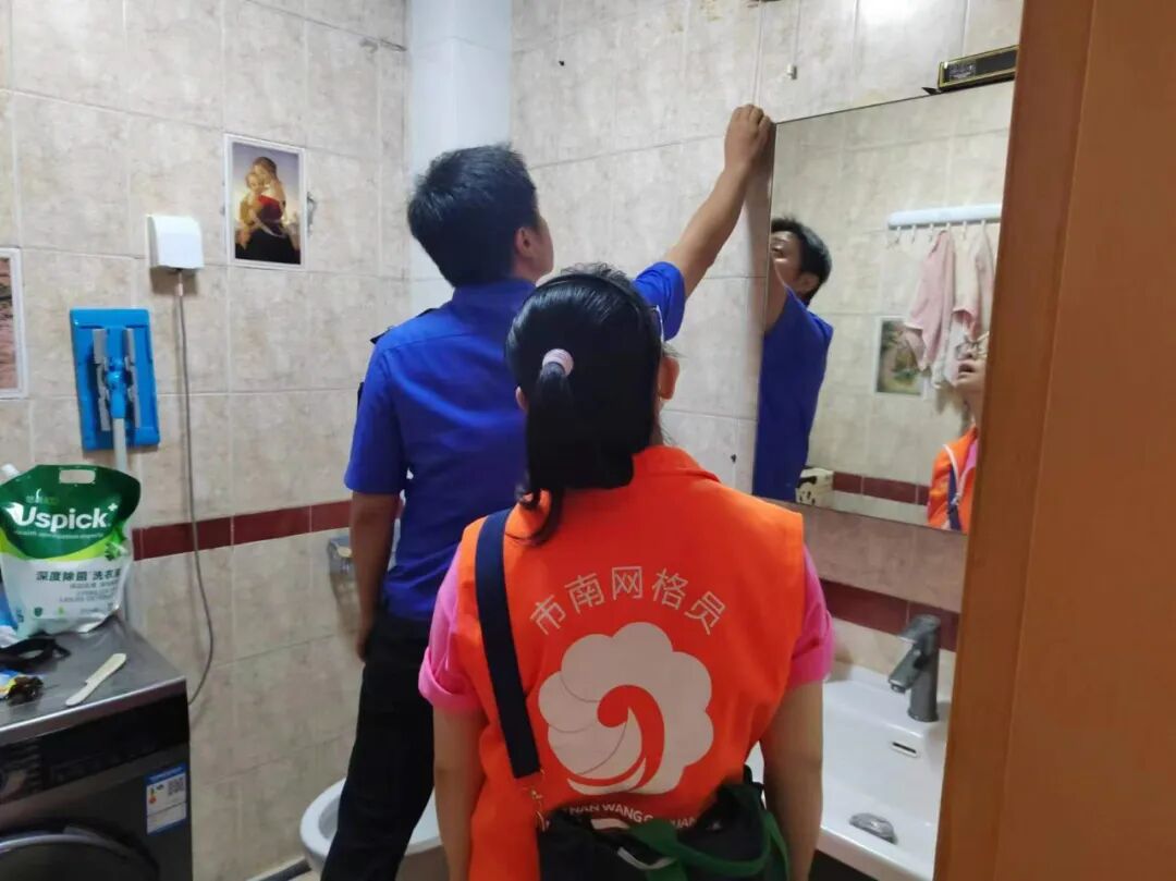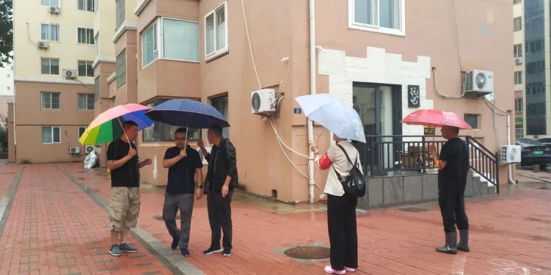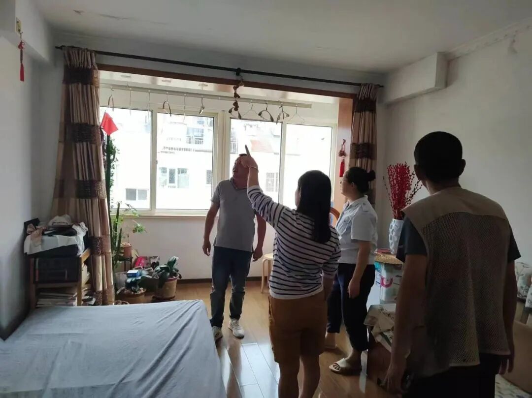 社区008网格长修玉洁,带领网格员到燕儿岛路64号居民家中查看雨后漏水情况,及时联系物业,解决居民烦心事。