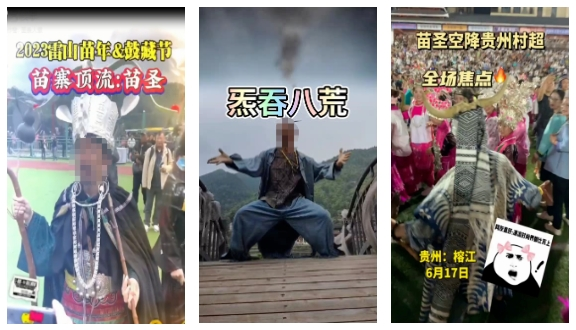 杨某某借助活动热度迅速蹿红网络后,利用广大网友对少数民族神话传说的猎奇心理,将自身包装成苗族所谓的“苗圣”形象,以宣传“苗族文化”“蚩尤文化”为名,在网络平台大量编造发布“苗族巫蛊术”“上古大神仙智慧”“科学修炼养生健康文化”“生命科学”等音视频内容,获得大批粉丝关注讨论。