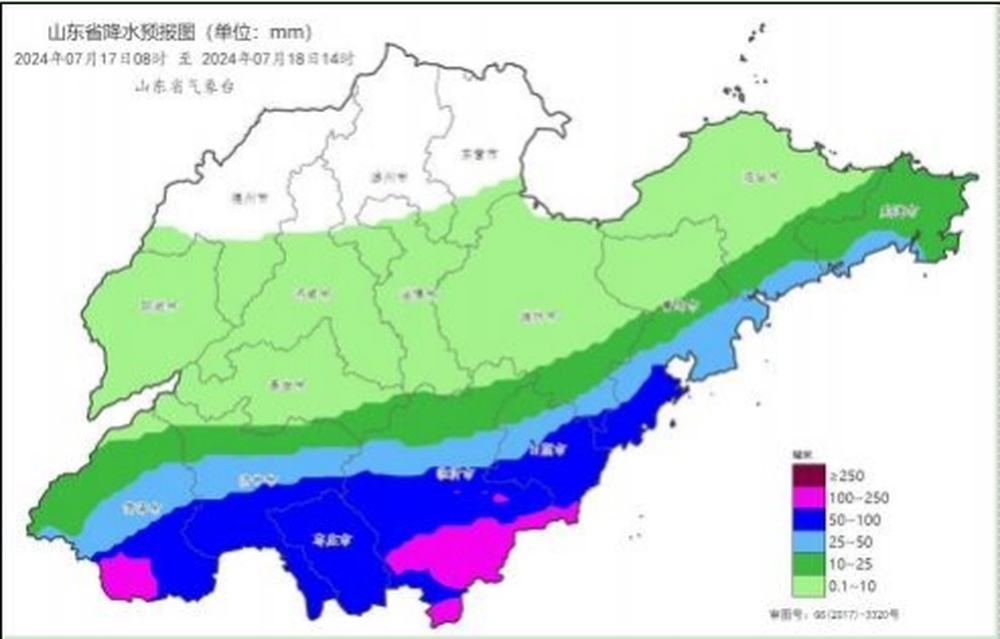 山东省气象台于7月17日09时00分发布暴雨黄色预警:受副高边缘暖湿气流和冷空气共同影响,15日下午至16日夜间,鲁中、鲁南和半岛的部分地区出现大到暴雨局部大暴雨,鲁西北地区出现小到中雨局部大雨。