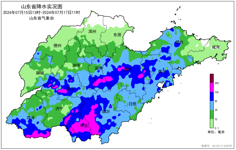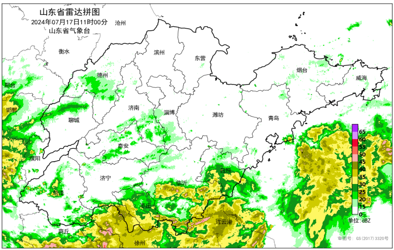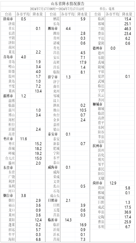 山东省气象台于7月17日11时00分继续发布暴雨黄色预警:预计17日下午到18日上午,鲁南地区仍将有强降雨,部分地区有短时强降水和雷电,最大1小时降水量40~80毫米,雷雨地区雷雨时阵风8~10级,局部11级。全省累积平均降水量15~25毫米。其中,菏泽南部、济宁南部、枣庄、临沂南部、日照和青岛南部有大到暴雨局部大暴雨(40~70毫米局部150~250毫米),菏泽北部、济宁北部、临沂北部、聊城、泰安、济南、淄博南部、潍坊、青岛北部、烟台和威海有小到中雨局部大雨(5~15毫米局部25毫米以上),其他地区局部有雷雨或阵雨。 17日下午到18日白天,全省天气阴,菏泽南部、济宁南部、枣庄、临沂南部、日照南部和青岛南部有大到暴雨局部大暴雨并伴有雷电,鲁西北地区局部有雷雨或阵雨,其他地区有小雨局部中雨或大雨并伴有雷电。半岛地区南风4~5级阵风6~7级,其他地区南风短时北风3~4级,雷雨地区雷雨时阵风8~10级局部11级。 18日夜间到19日白天,鲁南地区天气多云转阴有雷雨或阵雨,其他地区天气多云。南风,半岛地区4~5级,其他地区3~4级,雷雨地区雷雨时阵风8~10级。 19日夜间到20日白天,全省天气多云转阴,鲁南地区有中到大雨局部暴雨并伴有雷电,鲁西北地区局部有雷雨或阵雨,其他地区有小雨局部中雨并伴有雷电。南风,半岛地区4~5级阵风6~7级,其他地区3~4级,雷雨地区雷雨时阵风8~10级。
