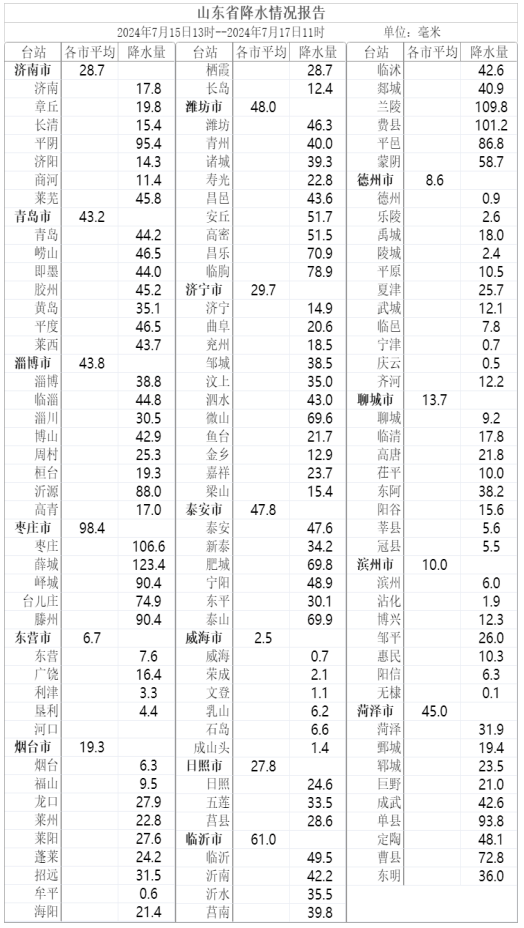 表2 2024年7月15日13时—7月17日11时山东省过程降水量