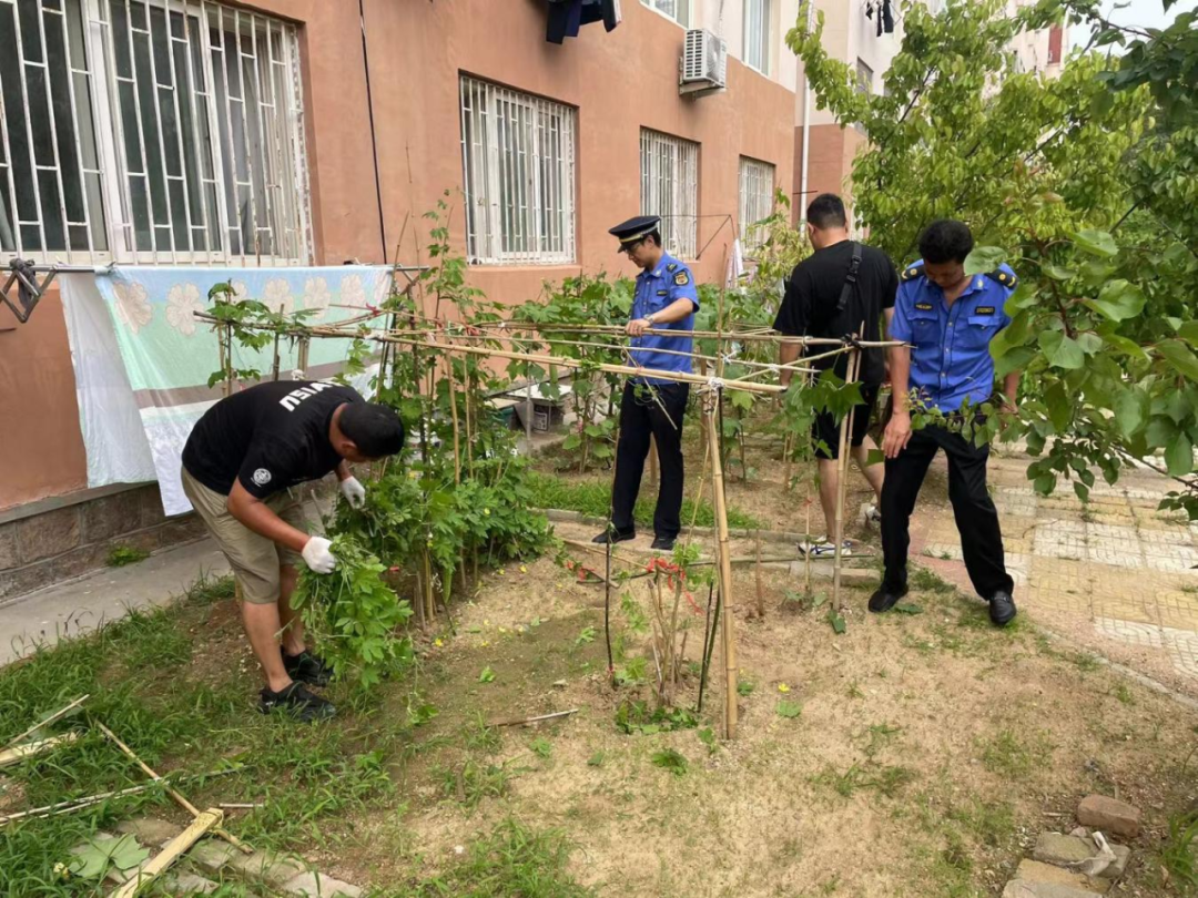 清理过程中,执法队员告知当事人小区内“圈地种菜”属于违法行为,向其讲解了毁坏公共绿化对环境造成的不良影响,并与社区工作人员一起将公共绿地上私自种植的蔬菜等作物铲除。此次整治共出动工作人员10余人,对小区内共计20余处、面积200余平方米占用公共绿地种植的蔬菜进行清理。