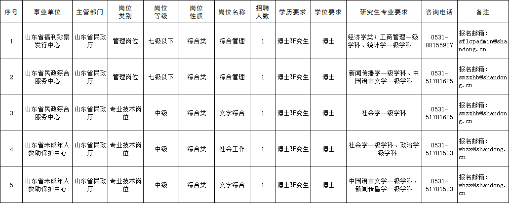 招聘岗位和人数拟面向社会公开招聘博士研究生工作人员5名。具体岗位及条件详见《山东省民政厅所属事业单位公开招聘工作人员岗位汇总表》。
