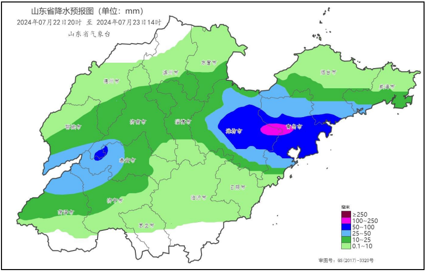 图1 2024年7月22日20时—23日14时山东省降水预报(毫米)