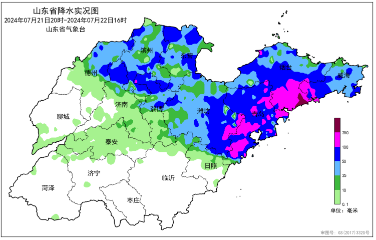 7月21日20时至22日16时,全省共有14市86县(区市)、1167乡镇出现降水(图3),平均降水量23.9,折合水3量约37.5亿方。各市平均:青岛78.6、烟台62.0、威海48.8、潍坊46.0、东营37.9、滨州36.9、淄博28.0、德州15.4、济南10.2、日照5.0和泰安2.1,其他市不足1.0或无降水。县(区市)平均降水量超过100.0的3个,50.0—100.0的17个,25.0—50.0的33个,前3位的是:烟台海阳224.5、烟台莱阳124.0和青岛胶州107.6。所有站点超过250.0的有3个站,100.0—250.0的75个,50.0—100.0的304个,降水量前3位的是:烟台海阳凤城327.8、烟台海阳方圆279.2和烟台海阳大辛家256.1。