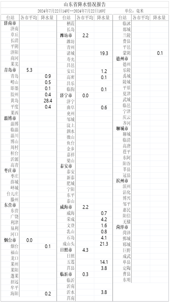 表 1 2024年7月22日14时—7月22日16时山东省降水量