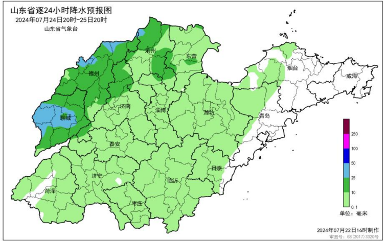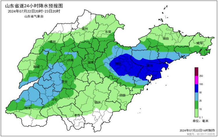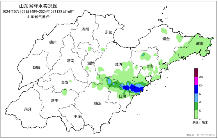 山东省气象台于7月22日16时00分降级暴雨黄色预警为暴雨蓝色预警:受副高边缘暖湿气流和冷空气共同影响,21日夜间至22日白天,烟台、威海、青岛、潍坊、滨州、东营和淄博北部出现了大到暴雨,烟台海阳出现特大暴雨。目前,强降雨范围和强度明显减弱。预计22日夜间至23日上午,潍坊和青岛有大雨或暴雨局部大暴雨(30~60毫米局部100~150毫米),菏泽北部、济宁北部、聊城、泰安、济南南部、淄博和烟台南部有中雨局部暴雨(10~20毫米局部50毫米以上),其他地区局部有雷雨或阵雨。强降雨地区伴有雷电和8~10级雷雨阵风,最大1小时降水量50~80毫米。强降雨区域暴雨灾害风险较高,低洼地块和路段可能出现积水或内涝,隐患点附近容易出现山洪、地质灾害和中小河流洪水,部分水库塘坝面临风险。请加强防范。