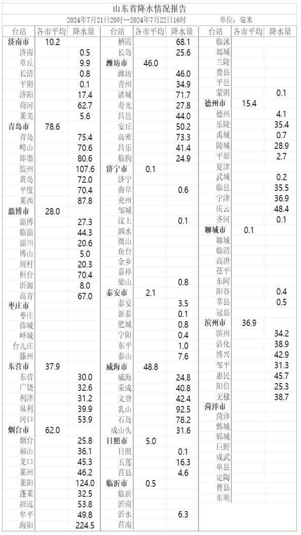 表 2 2024年7月21日20时—7月22日16时山东省过程降水量