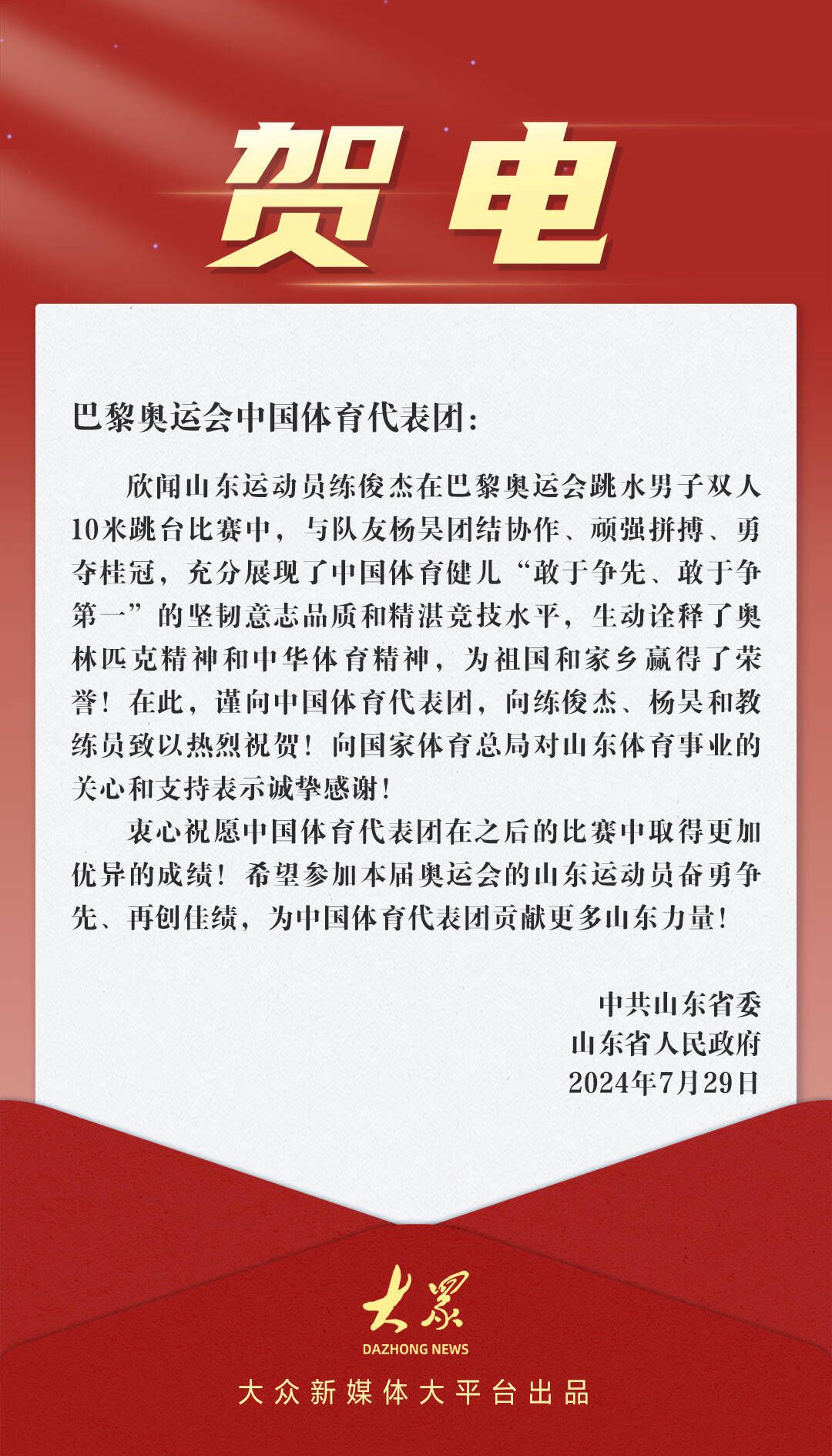 赛后,中共山东省委、山东省人民政府向巴黎奥运会中国体育代表团致贺电。全文如下: