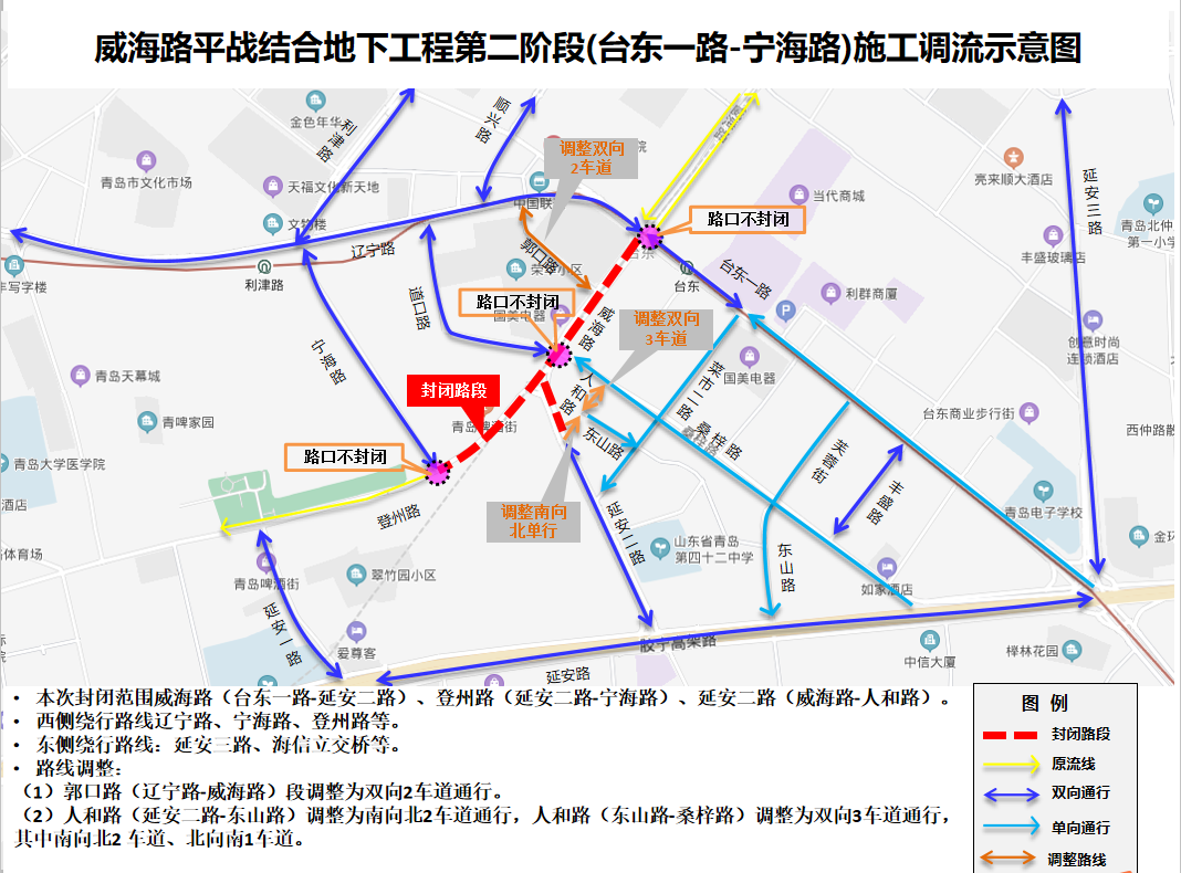 本次封闭范围为威海路(台东一路-延安二路)、登州路(延安二路-宁海路)、延安二路(威海路-人和路)。西侧绕行路线为辽宁路、宁海路、登州路等,东侧绕行路线为延安三路、延安路等。