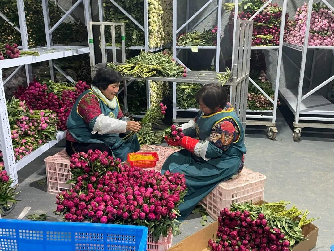 菏泽市牡丹区都司镇妇女群众在车间包装鲜切花。
