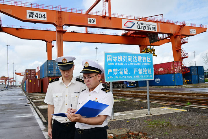青岛海关工作人员在上合示范区多式联运中心查验国际班列货物(2024年7月26日摄)。新华社记者 李紫恒 摄