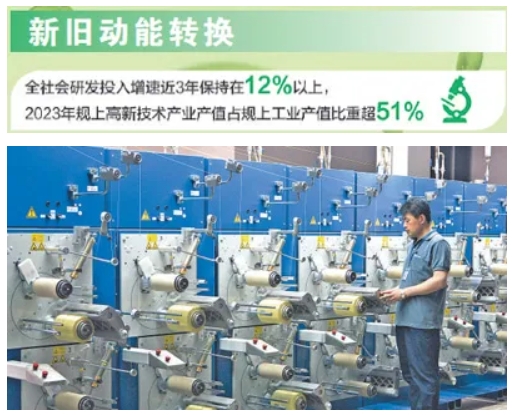 深化新旧动能转换。统筹优化传统产业,壮大新兴产业,布局未来产业,全社会研发投入增速近3年保持在12%以上,2023年规上高新技术产业产值占规上工业产值比重超51%,经营主体达1474万家。