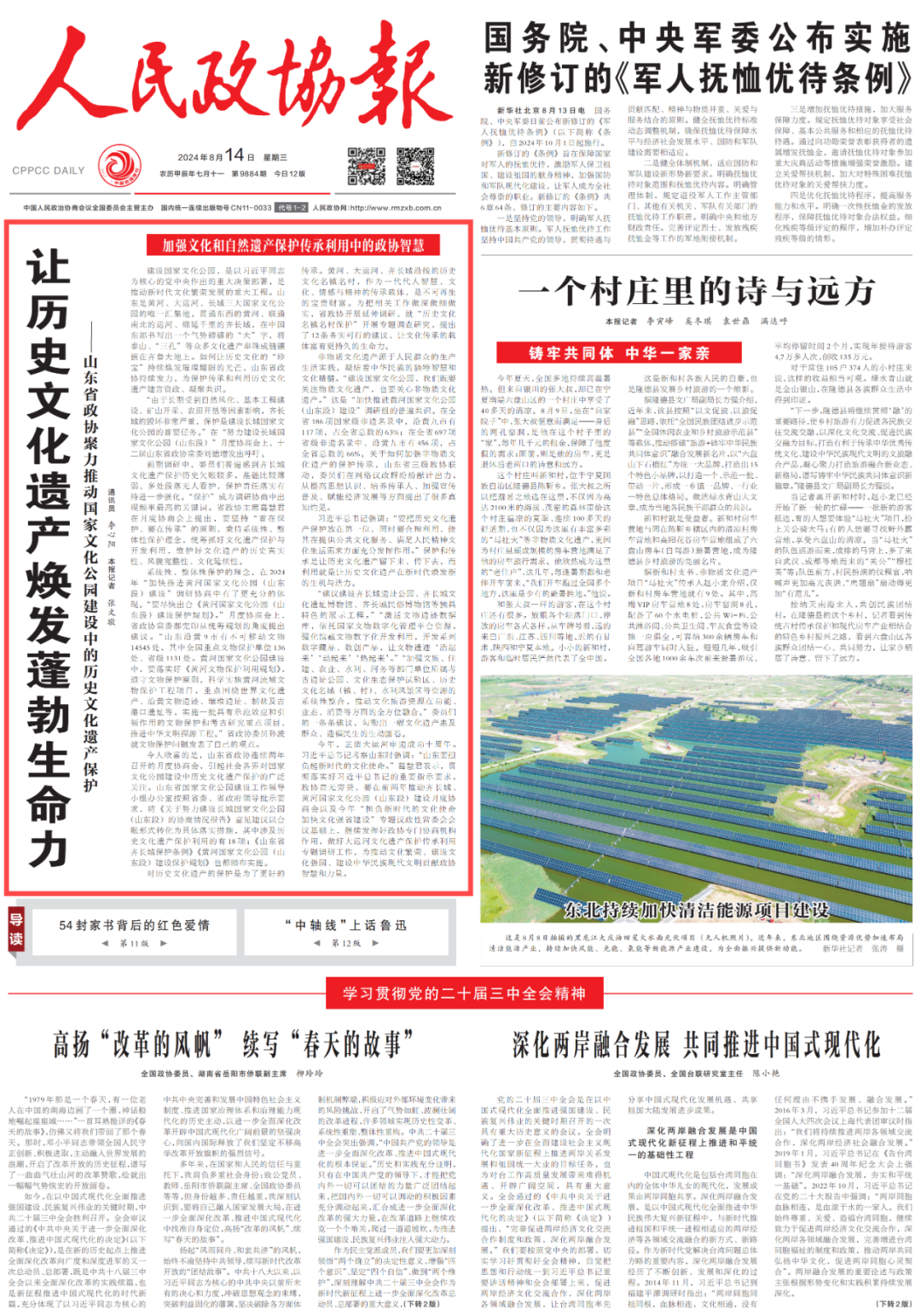 8月14日出版的《人民政协报》头版刊发文章《让历史文化遗产焕发蓬勃生命力——山东省政协聚力推动国家文化公园建设中的历史文化遗产保护》。全文分享如下↓