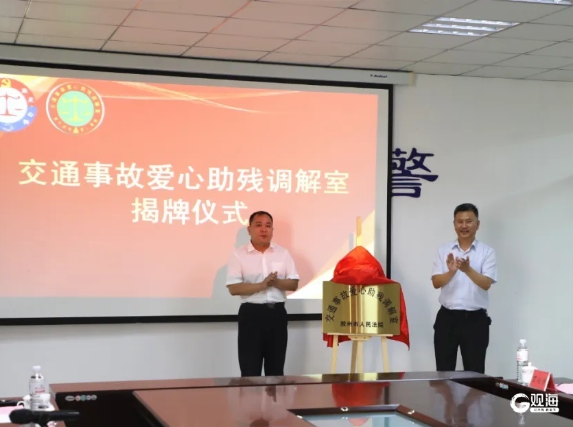 青岛日报社/观海新闻8月16日讯 为持续加强涉残疾人纠纷前端多元化解工作,更好维护残疾人合法权益,8月15日,胶州市人民法院、胶州市司法局、胶州市公安局、胶州市残疾人联合会在胶州法院"道交一体化"诉裁中心共同建立"交通事故爱心助残调解室",这是青岛市首家以化解涉残交通事故纠纷为主要职责的调解工作室。胶州市人民法院党组书记、院长白强,胶州市残疾人联合会党组书记、理事长逄鹏飞,胶州市司法局党委书记、局长王承锡,胶州市公安局党委委员、副局长赵成德,以及胶州市法院、市公安局、市司法局、市残联分管负责同志及调解室特聘调解员参加此次活动。