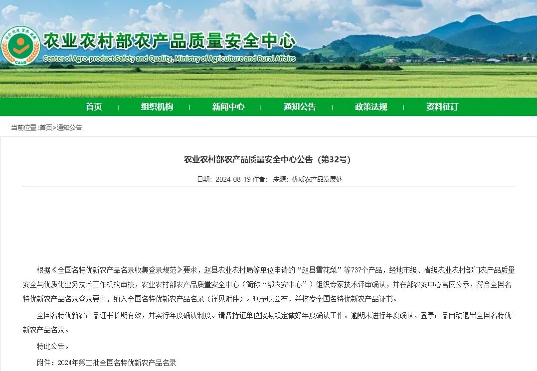 全国名特优新农产品,是指在特定区域(原则上以县域为单元)内生产、具备一定生产规模和商品量、具有显著地域特征和独特营养品质特色、有稳定的供应量和消费市场、公众认知度和美誉度高并经农业农村部农产品质量安全中心登录公告和核发证书的农产品(包括种植业和养殖业产品及其产地初加工产品)。