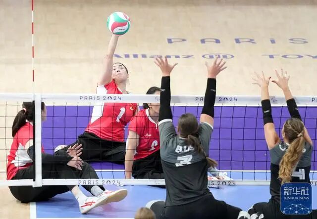 中国队球员唐雪梅(左二)在坐式排球比赛中进攻。 图源|新华社