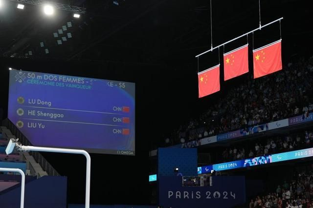 巴黎残奥会游泳女子50米仰泳S5级决赛中,中国选手卢冬、何聖羔、刘玉包揽冠亚季军。 图源|央视网