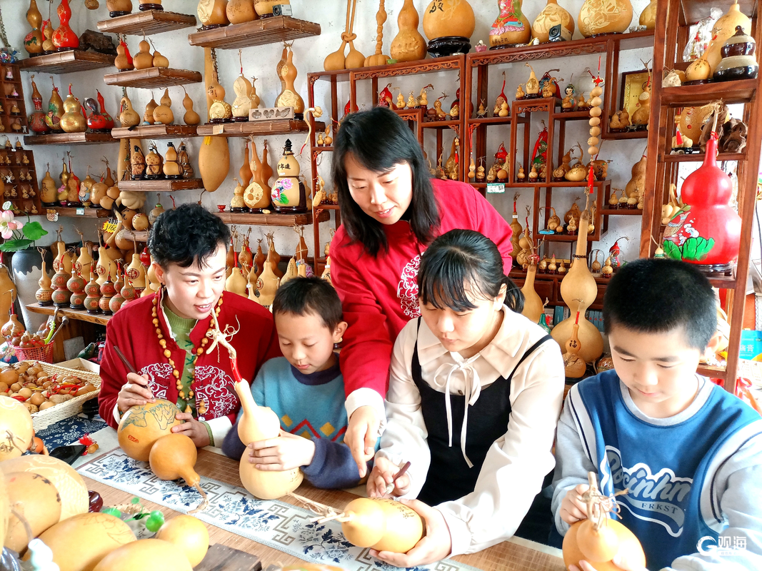 付文学、付文文姐妹在即墨古城葫芦工艺坊指导小朋友们雕刻葫芦