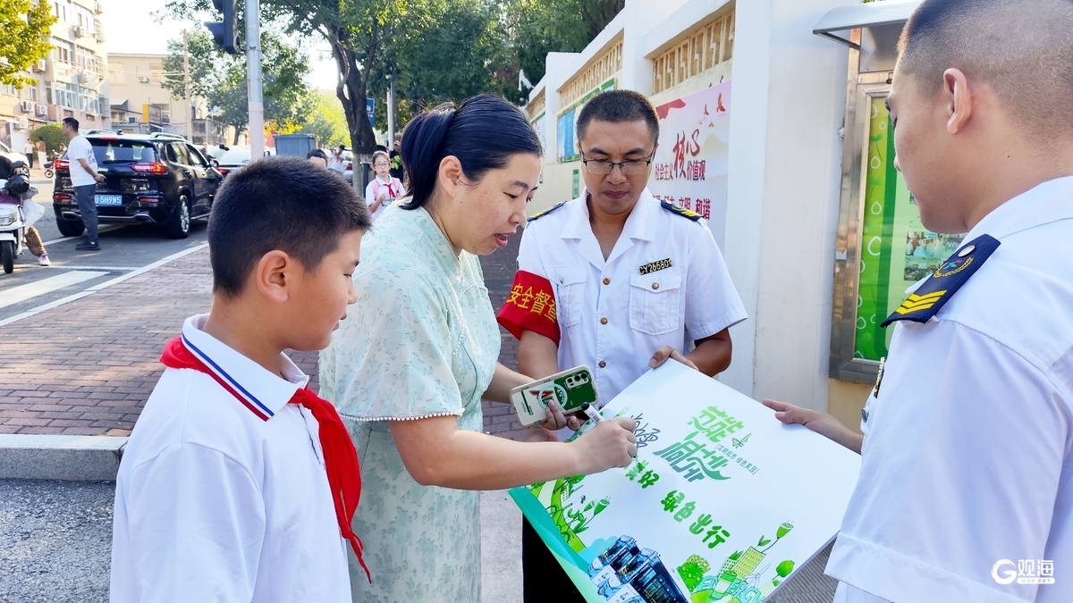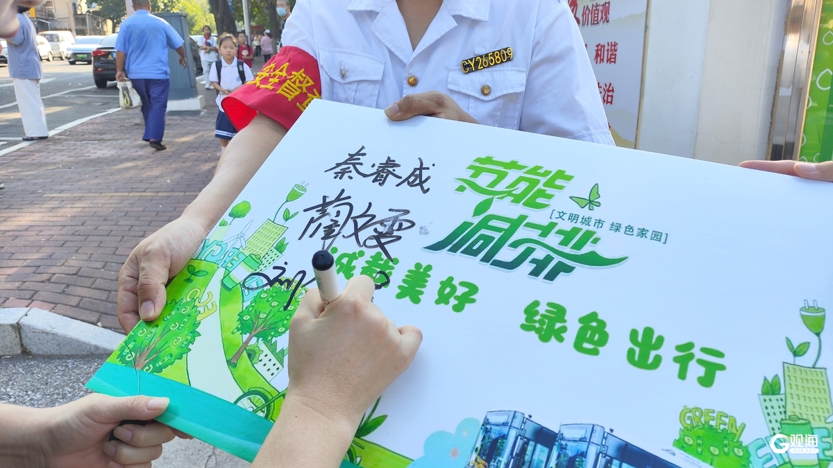 此外,记者注意到,在离校门口不远处,有两位志愿者正举着“诚载美好 绿色出行”倡议书,邀请来往市民在倡议书上签字表承诺。“刚刚我在倡议书上签了自己的名字,也是许下了一个承诺,今后要尽量选择绿色的出行方式。”另一位家长指着倡议书激动说道。
