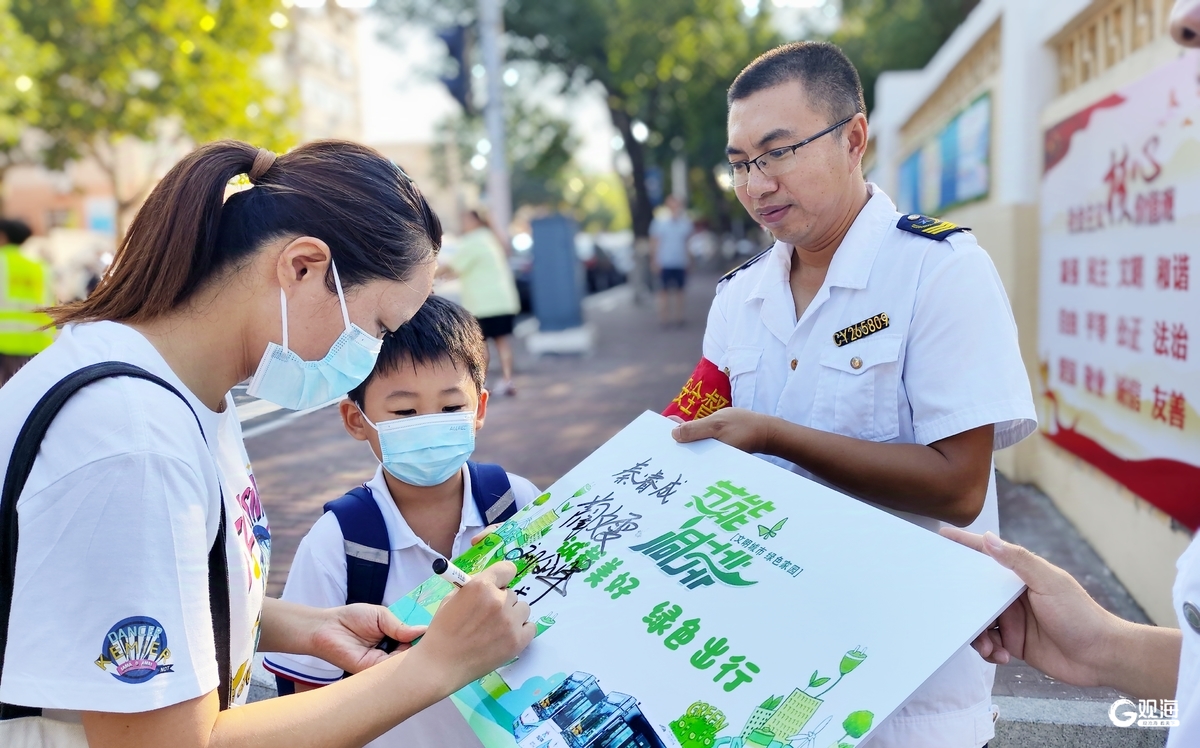 9月10日清晨,“我倡议——文明交通·绿色出行”签名活动正式开始。7时30分左右,李沧巴士第五分公司志愿者赶在上学时间来到青岛永平路小学门口。“请选择公交出行、骑行等绿色出行方式”“绿色出行既能减轻环境污染,还能减少资源浪费”……现场,记者看到,公交志愿者分散在学校门口,不停地向来往学生和学生家长发放绿色出行宣传单页,宣传绿色出行理念。