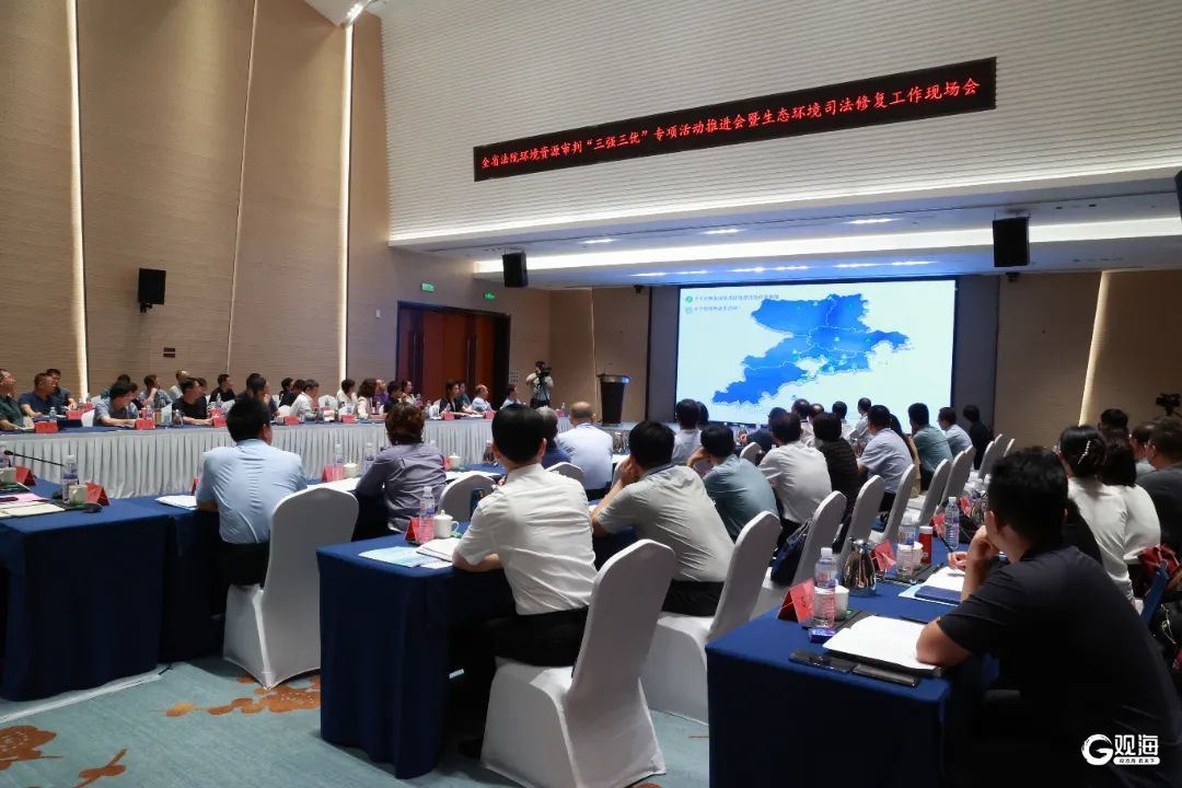 会前,与会人员赴即墨区实地观摩耕地司法保护修复示范基地、巡回审判工作室和生态环境司法保护宣传教育基地。会上,青岛、威海、聊城、滨州、菏泽五家中院作典型发言。其他中级人民法院、济南铁路运输中级人民法院、青岛海事法院分别汇报了“三强三优”环境资源审判品牌创建专项活动亮点、典型案事例及存在的问题和建议。